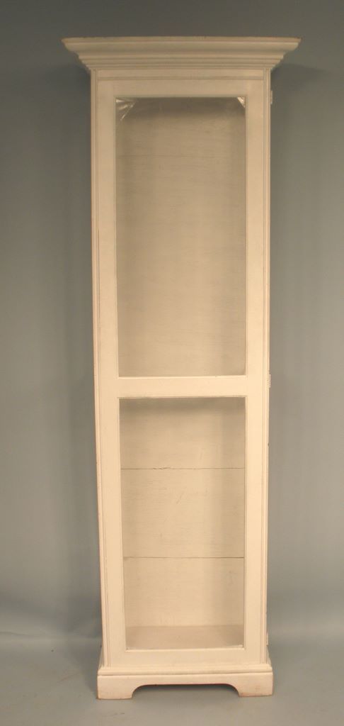 Perfect for tight space, tall slender display case, white finish with spotlight. W. 19-1/2", d. 11-3/8", h. 76" Perfect for tight space, tall slender display case, white finish with spotlight. W. 19-1/2", d. 11-3/8", h. 76"