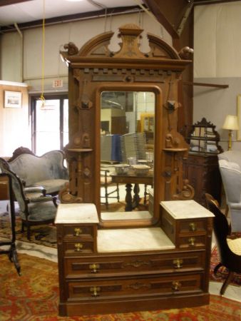Walnut Victorian Drop Dresser, with marble top. 84" h., 48" w. Walnut Victorian Drop Dresser, with marble top. 84" h., 48" w.