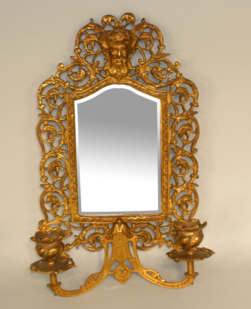 Ornate Beveled Looking Glass with double candle holder mounted on front, brass with greek god like figure on top. W. 9-1/2", h. 15" Ornate Beveled Looking Glass with double candle holder mounted on front, brass with greek god like figure on top. W. 9-1/2", h. 15"