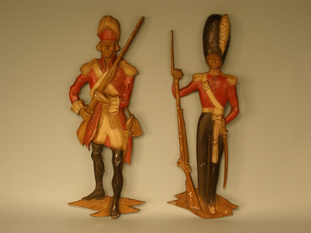 Pair of Sexton, light-weight metal wall plaques, one marked British Army, the other Boston Fusselier. w. 7", h. 21". Pair of Sexton, light-weight metal wall plaques, one marked British Army, the other Boston Fusselier. w. 7", h. 21".