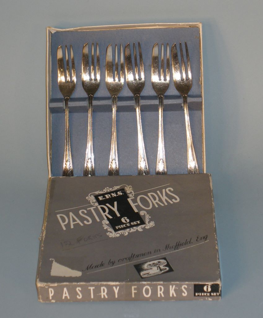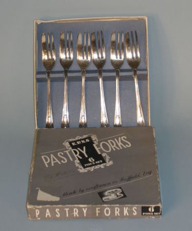 Six Dessert Knives, E.P.N.S. Pastry forks in original box marked mage by craftsman in Sheffield England. 5-1/2" Six Dessert Knives, E.P.N.S. Pastry forks in original box marked mage by craftsman in Sheffield England. 5-1/2"
