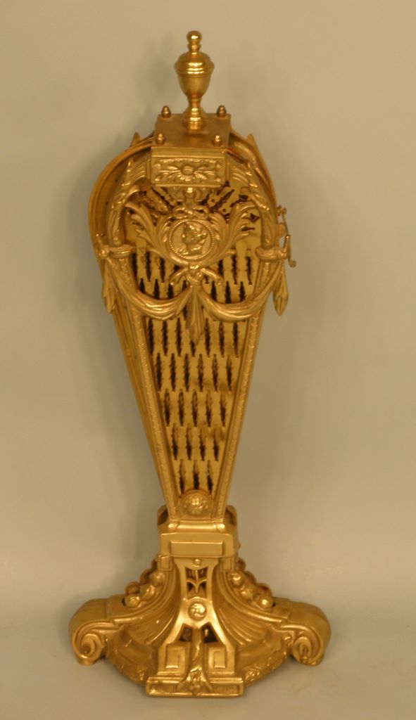 Cast and Reticulated Brass Folding Fire screen, of fan form in the Louis XVI taste, third quarter 20th century, the upper standard with a Roman Head masque. Cast and Reticulated Brass Folding Fire screen, of fan form in the Louis XVI taste, third quarter 20th century, the upper standard with a Roman Head masque.