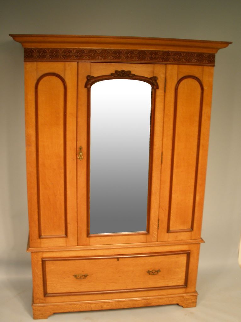 Super Oak Wardrobe with mirrored door with drawer under, mixed wood of oak, walnut and chestnut. W. 49", d. 19-1/4", h. 79-1/2" Super Oak Wardrobe with mirrored door with drawer under, mixed wood of oak, walnut and chestnut. W. 49", d. 19-1/4", h. 79-1/2"