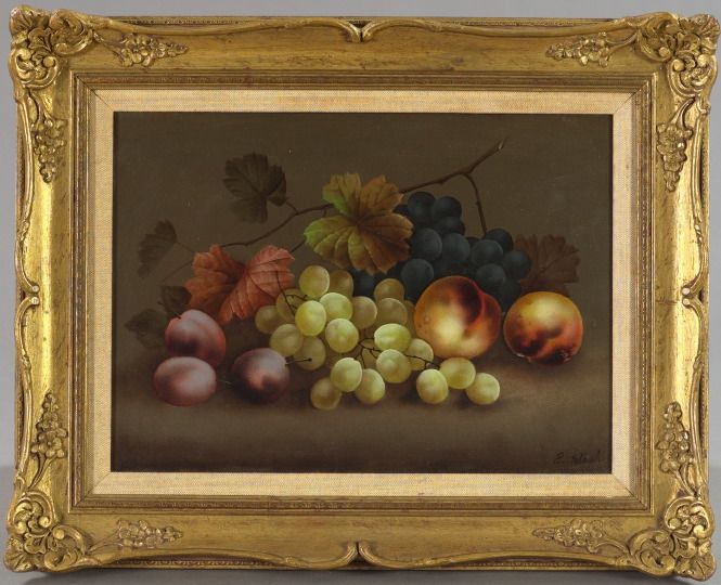 American School (20th Century) "Still Life with Grapes, Plums and Peaches", oil on canvas, 10-3/4" x 15-1/2", signed indistinctly lower right. Presented in a carved giltwood frame with linen liner. American School (20th Century) "Still Life with Grapes, Plums and Peaches", oil on canvas, 10-3/4" x 15-1/2", signed indistinctly lower right. Presented in a carved giltwood frame with linen liner.