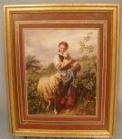 English School Print "Girl and Lamb", matted in gold frame. W. 25-1/2", h. 31-1/2" English School Print "Girl and Lamb", matted in gold frame. W. 25-1/2", h. 31-1/2"