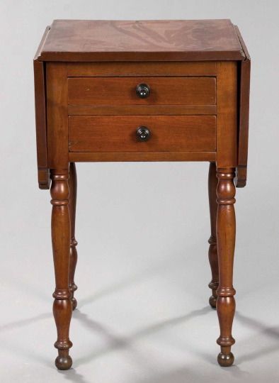 American Sheraton Cherrywood Drop-Leaf Work Table, second quarter 19th century, the top with two drop leaves with shaped corners, over two drawers, raised on turned legs, h. 29", w. 18-1/2", d. 21-1/2", extended l. 41". American Sheraton Cherrywood Drop-Leaf Work Table, second quarter 19th century, the top with two drop leaves with shaped corners, over two drawers, raised on turned legs, h. 29", w. 18-1/2", d. 21-1/2", extended l. 41".