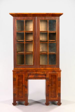 American Late Classical Mahogany Secretary-Bookcase, second quarter 19th century, in two parts, the upper section with a projecting figural cornice over a pair of mullioned doors, the doors retaining most of their antique glazing, the base with a kneehole opening beneath a drawer fitted with a writing surface, flanked by paneled doors on demi-lune feet, h. 83-1/2", w. 24-1/2", d. 14-1/2". American Late Classical Mahogany Secretary-Bookcase, second quarter 19th century, in two parts, the upper section with a projecting figural cornice over a pair of mullioned doors, the doors retaining most of their antique glazing, the base with a kneehole opening beneath a drawer fitted with a writing surface, flanked by paneled doors on demi-lune feet, h. 83-1/2", w. 24-1/2", d. 14-1/2".