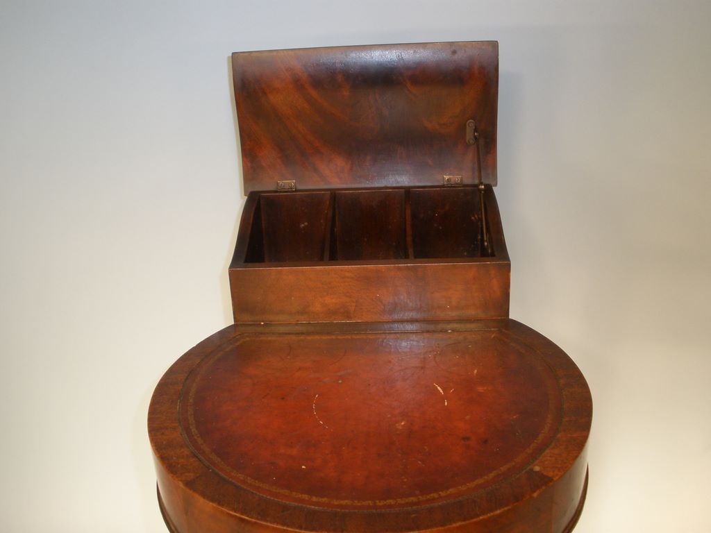 Usual Flame Mahogany Side Table with compartment and original leather top. W. 14-1/4", d. 18", h. 26" Usual Flame Mahogany Side Table with compartment and original leather top. W. 14-1/4", d. 18", h. 26"