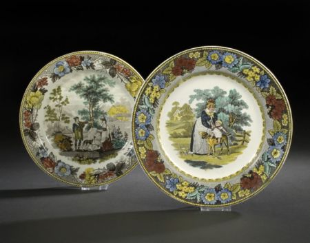 Two Creil Underglaze Transfer-Printed and Polychrome-Overglaze Creamware Dessert Plates. Dia. 10-1/2" Two Creil Underglaze Transfer-Printed and Polychrome-Overglaze Creamware Dessert Plates. Dia. 10-1/2"