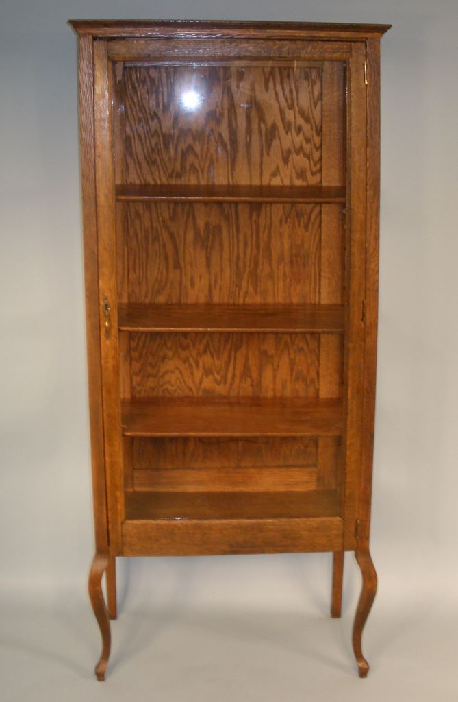 Oak Single Door Display Cabinet, with three shelves. W. 26-1/2", d. 13-1/2", h. 63-1/2" Oak Single Door Display Cabinet, with three shelves. W. 26-1/2", d. 13-1/2", h. 63-1/2"