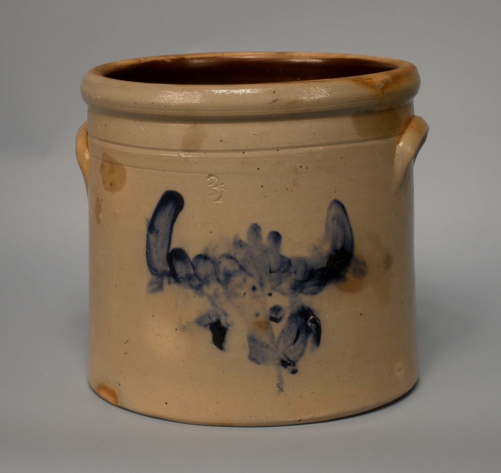 American Blue and Gray Stoneware Two-Handled Three-Gallon Storage Crock, third quarter 19th century, the facade centered with a blue overglaze stylized floral spray, h. 10'", w. 11". American Blue and Gray Stoneware Two-Handled Three-Gallon Storage Crock, third quarter 19th century, the facade centered with a blue overglaze stylized floral spray, h. 10'", w. 11".