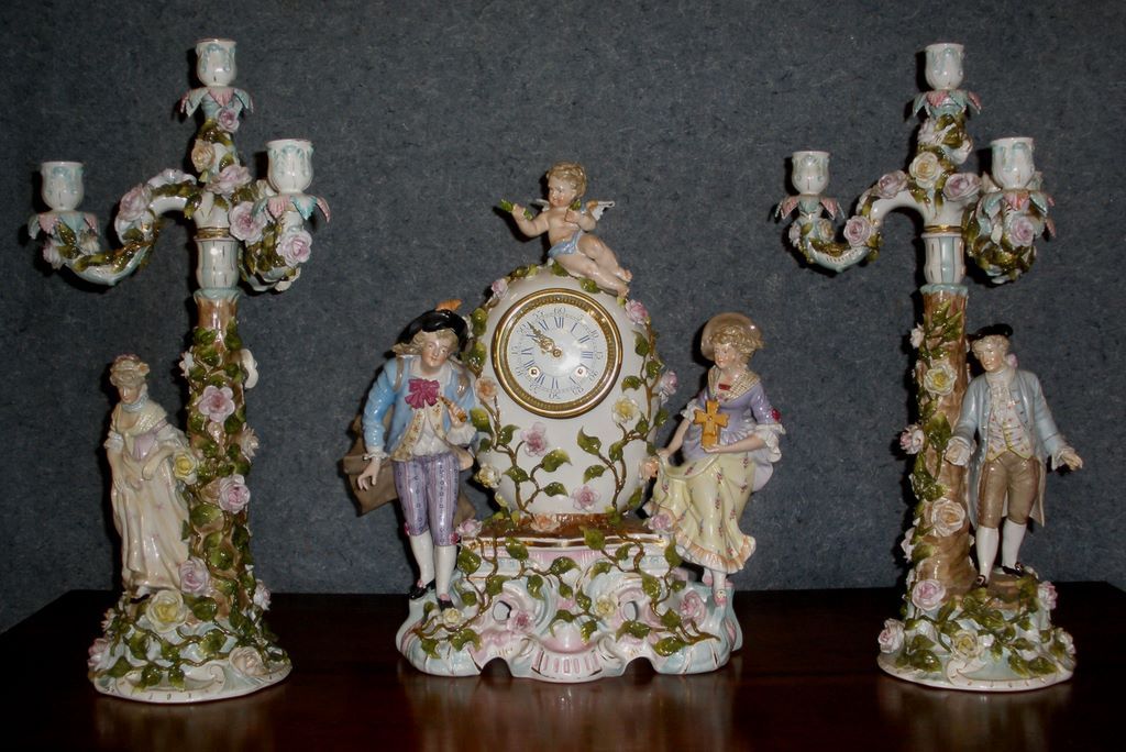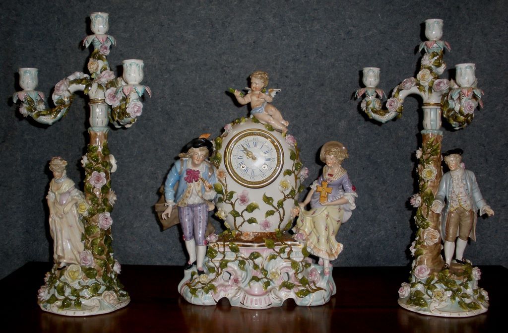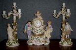 Fine Dresden Clock set consisting of Clock and two Candelabras, in excellent condition, marked on bottom, clock 17 1/4" h., 15" w., candelabras 21" h., 10 1/4" w. Fine Dresden Clock set consisting of Clock and two Candelabras, in excellent condition, marked on bottom, clock 17 1/4" h., 15" w., candelabras 21" h., 10 1/4" w.