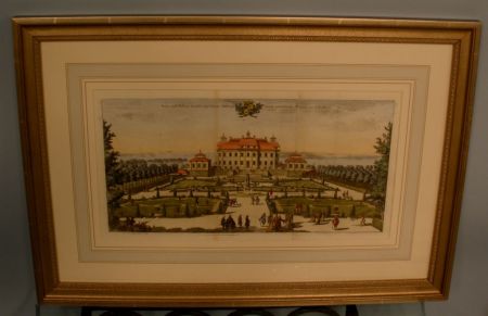 Eric Dahlberg (Swedish, 1625-1703) "Estates and Gardens", hand-colored copper engraving, Stockholm, 1696-1704. Glazed, matted and presented in silvered wood frame. w. 25-1/4", h. 17-1/4" Eric Dahlberg (Swedish, 1625-1703) "Estates and Gardens", hand-colored copper engraving, Stockholm, 1696-1704. Glazed, matted and presented in silvered wood frame. w. 25-1/4", h. 17-1/4"