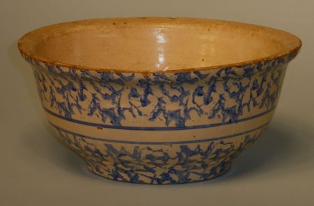 American Blue and White Sponge-Bordered and Banded Pottery Kitchen Bowl. Dia. 10-1/4", h. 4-3/8" American Blue and White Sponge-Bordered and Banded Pottery Kitchen Bowl. Dia. 10-1/4", h. 4-3/8"