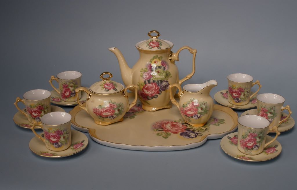 Very Pretty Tea Service with six cups and saucers and tray, cream color with painted floral design. Very Pretty Tea Service with six cups and saucers and tray, cream color with painted floral design.
