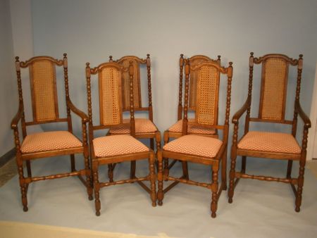 Set of 6 English Oak Dining Chairs, with cane backs and fabric seats, two arm chairs and 4 side chairs, first quarter 20th Century. w. 17-1/2", d. 15", h. 41" Set of 6 English Oak Dining Chairs, with cane backs and fabric seats, two arm chairs and 4 side chairs, first quarter 20th Century. w. 17-1/2", d. 15", h. 41"