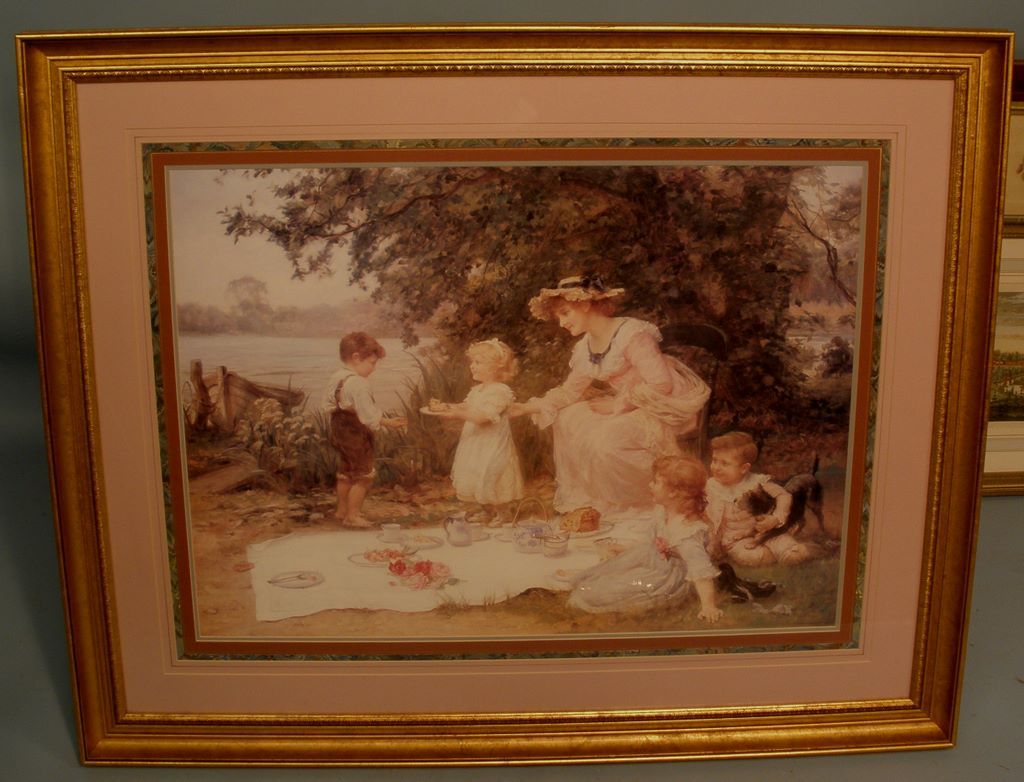 American School Print "The Picnic", matted in gold frame. W. 42", h. 34" American School Print "The Picnic", matted in gold frame. W. 42", h. 34"