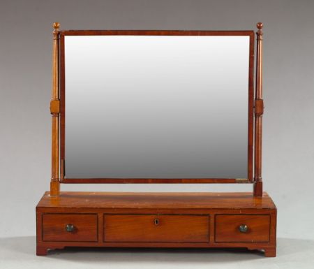 Attractive Georgian Beaded Mahogany Shaving Mirror, first quarter 19th century, in the manner of Thomas Sheraton, the base fitted with a trio of small drawers, the swing mirror of rectangular form, h. 21-1/2", w. 22", d. 9". Attractive Georgian Beaded Mahogany Shaving Mirror, first quarter 19th century, in the manner of Thomas Sheraton, the base fitted with a trio of small drawers, the swing mirror of rectangular form, h. 21-1/2", w. 22", d. 9".