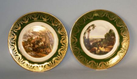Pair of Engligh Countryside Scene Plates, rounded by green and gold trim. Pair of Engligh Countryside Scene Plates, rounded by green and gold trim.