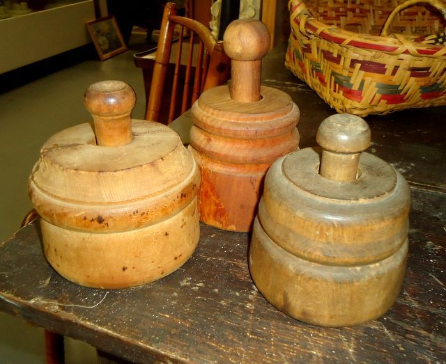 Three wooden butter molds height ranges from 4 1/2" to 5 1/2" Three wooden butter molds height ranges from 4 1/2" to 5 1/2"