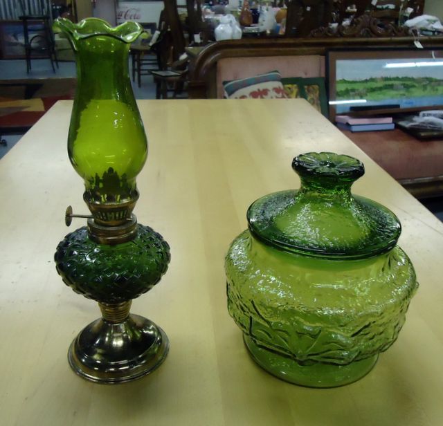 Oil Lamp and Jar with Lid Small green glass oil lamp 9 1/4h and green jar with lid 6 1/4" Oil Lamp and Jar with Lid Small green glass oil lamp 9 1/4h and green jar with lid 6 1/4"