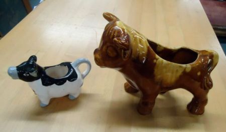 372 Bull and Cow Brown bull 6 3/4"h, black and white cow 3 3/4"h