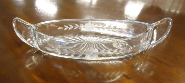 Etched Glass handled Relish Dish; 8" l., 3" w. Etched Glass handled Relish Dish; 8" l., 3" w.