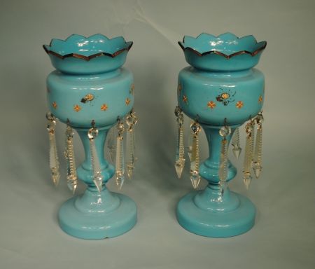 Pair Victorian Glass Lusters with original prisms, crack & chip in the base of one. 15"h 7"w Pair Victorian Glass Lusters with original prisms, crack & chip in the base of one. 15"h 7"w