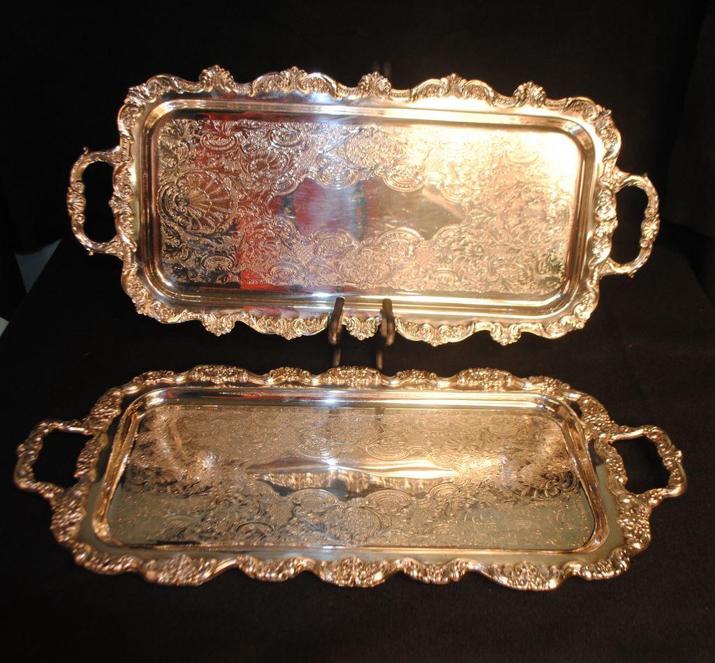 Two silver plate sandwich trays, one Towle, one Wallace. Both are 24.5"h and 10.5"w. Two silver plate sandwich trays, one Towle, one Wallace. Both are 24.5"h and 10.5"w.