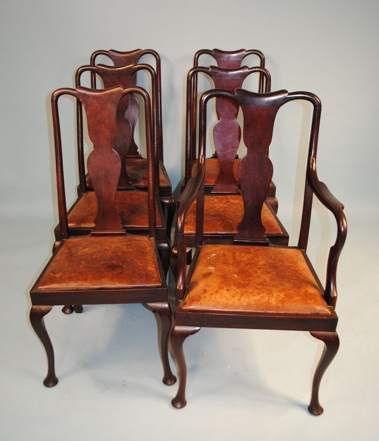 Set of Six Queen Anne Chairs (1 arm, 5 sides) with brown leather seats. 41"h 22"w 19"d. Set of Six Queen Anne Chairs (1 arm, 5 sides) with brown leather seats. 41"h 22"w 19"d.