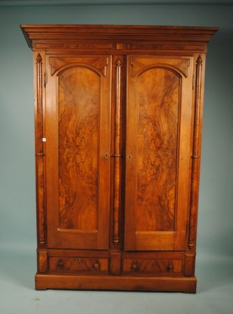 19th Century Eastlake Walnut Wardrobe with burl walnut doors, 2 drawers on base. Interior fitted with hooks. 54"w 19"d 88 1/2"h 19th Century Eastlake Walnut Wardrobe with burl walnut doors, 2 drawers on base. Interior fitted with hooks. 54"w 19"d 88 1/2"h