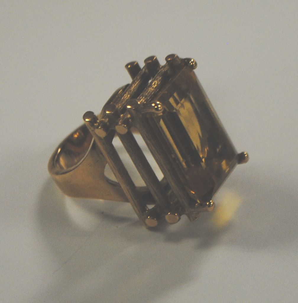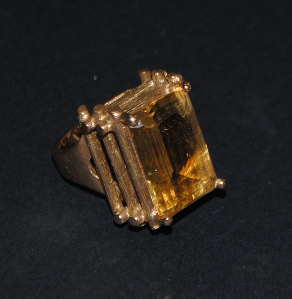 Lady's Log Cabin Style Citrine Ring. Emerald cut, transparent, lightly included, orangish-yellow Citrine, Quartz. Approx. 18.30 carats; approx. 20.00 x 14.00 x 9.10mm. Citrine is set in four (4) prong mounting that consist of a log cabin style top section with a tapered shank ring shank that tapers from 13.00 to 4.50 millimeters. Stamped: 14K. 14.38 DWT TGW Lady's Log Cabin Style Citrine Ring. Emerald cut, transparent, lightly included, orangish-yellow Citrine, Quartz. Approx. 18.30 carats; approx. 20.00 x 14.00 x 9.10mm. Citrine is set in four (4) prong mounting that consist of a log cabin style top section with a tapered shank ring shank that tapers from 13.00 to 4.50 millimeters. Stamped: 14K. 14.38 DWT TGW