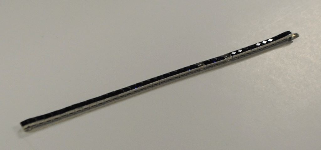 Channel Set Synthetic Sapphire Flex Style Bracelet. Forty (40) French cut, lightly included, medium dark blue Sapphire, Corundum. Approx. 4.50 x 3.50 x 1.90mm. Synthetic sapphires are channel set in a linear style flex bracelet that measures 7.00mm in length w/a hidden tongue and box style clasp w/a flip over safety clasp. 13.63 DWT TGW. Two (2) missing Synthetic Sapphires. Channel Set Synthetic Sapphire Flex Style Bracelet. Forty (40) French cut, lightly included, medium dark blue Sapphire, Corundum. Approx. 4.50 x 3.50 x 1.90mm. Synthetic sapphires are channel set in a linear style flex bracelet that measures 7.00mm in length w/a hidden tongue and box style clasp w/a flip over safety clasp. 13.63 DWT TGW. Two (2) missing Synthetic Sapphires.