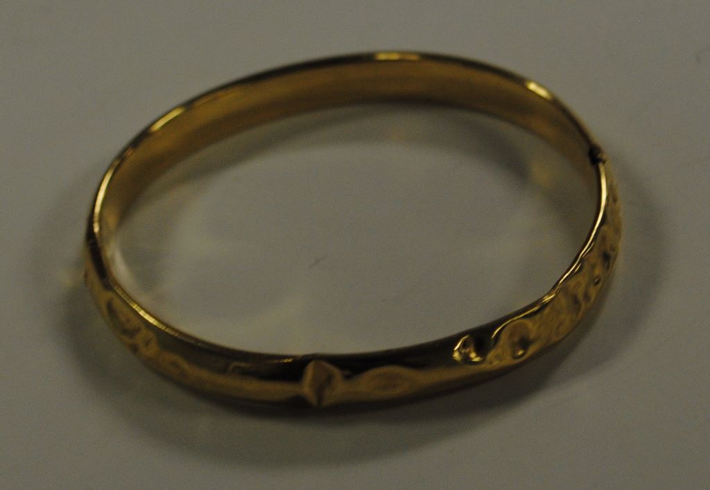 Lady's Yellow Metal Half Round Hollow Bangle Bracelet. Bracelet is 7.50mm wide w/multiple dents. 5.62 DWT TGW Lady's Yellow Metal Half Round Hollow Bangle Bracelet. Bracelet is 7.50mm wide w/multiple dents. 5.62 DWT TGW