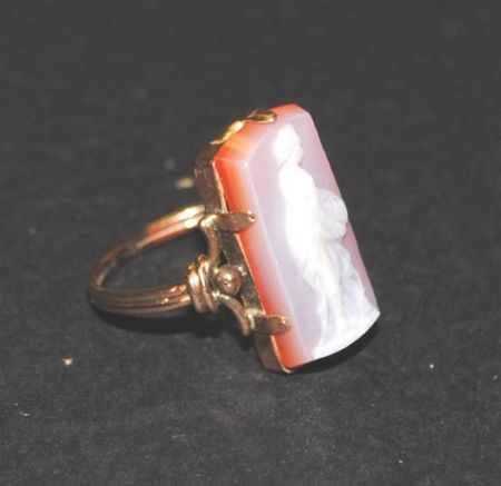 Lady's Rectangular Yellow Metal Ring with a Sardonyx, Chalcedony Cameo. Approx. 16.00 x 8.00 x 3.10mm. Cameo is set in six (6) prong mounting. Ring has a 1.50mm wide shank. 1.35 DWT TGW Lady's Rectangular Yellow Metal Ring with a Sardonyx, Chalcedony Cameo. Approx. 16.00 x 8.00 x 3.10mm. Cameo is set in six (6) prong mounting. Ring has a 1.50mm wide shank. 1.35 DWT TGW
