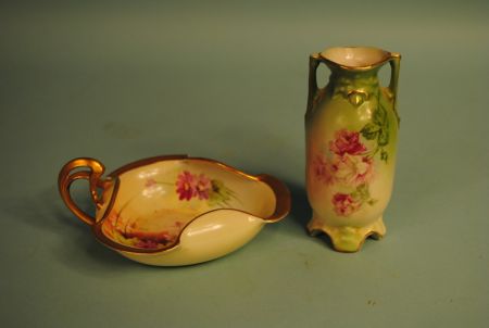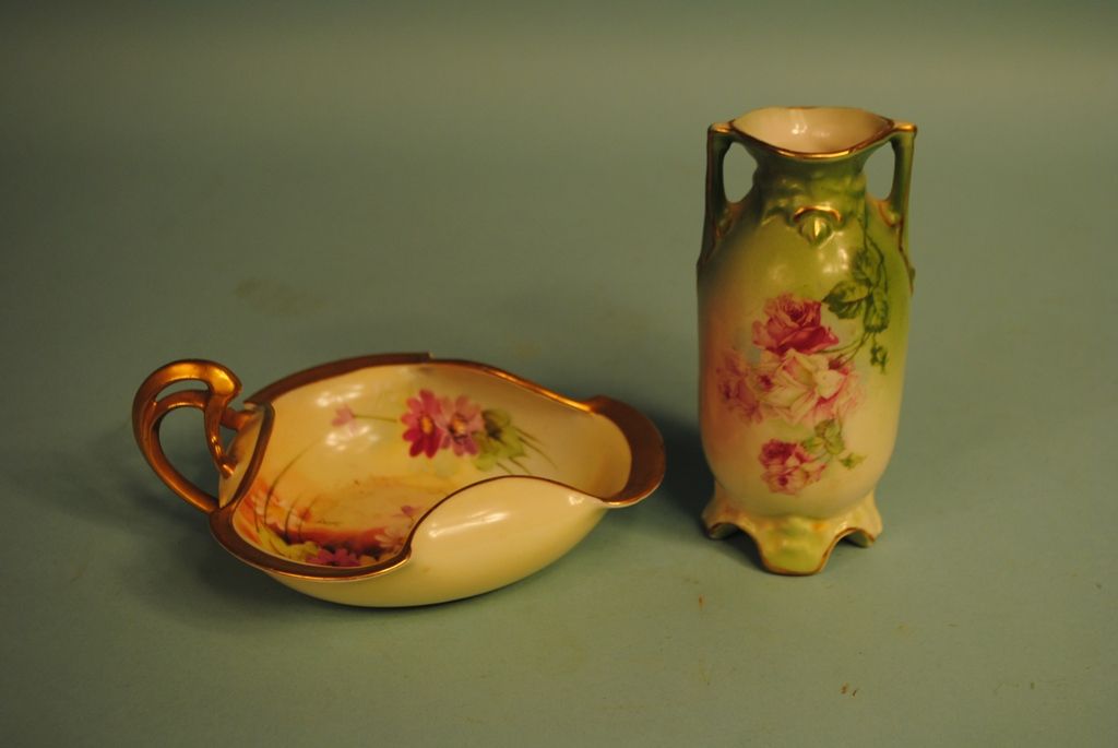 Hand-Painted Porcelain Nappie and Vase, signed by artist. 5 1/2" vase, 6" nappie Hand-Painted Porcelain Nappie and Vase, signed by artist. 5 1/2" vase, 6" nappie