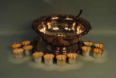 15 Piece Sheridan Taunton Silverplate-Vintage Punch Bowl Set. 17 1/2" tray, 12 cups & ladle 15 Piece Sheridan Taunton Silverplate-Vintage Punch Bowl Set. 17 1/2" tray, 12 cups & ladle