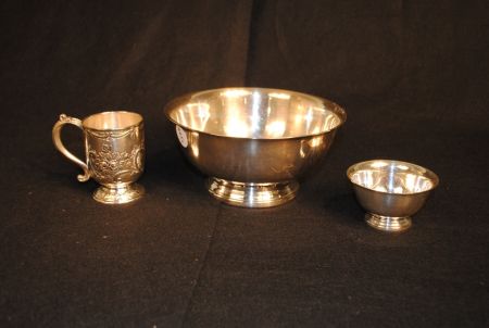 Gorham electroplate Bowl, 4"H 8"W; Reed & Barton Silverplate Custard Cup, Paul Revere Pattern,2"h 3 1/2 "w; Silverplate Handled Cup, 3 1/2h 4"w. Gorham electroplate Bowl, 4"H 8"W; Reed & Barton Silverplate Custard Cup, Paul Revere Pattern,2"h 3 1/2 "w; Silverplate Handled Cup, 3 1/2h 4"w.