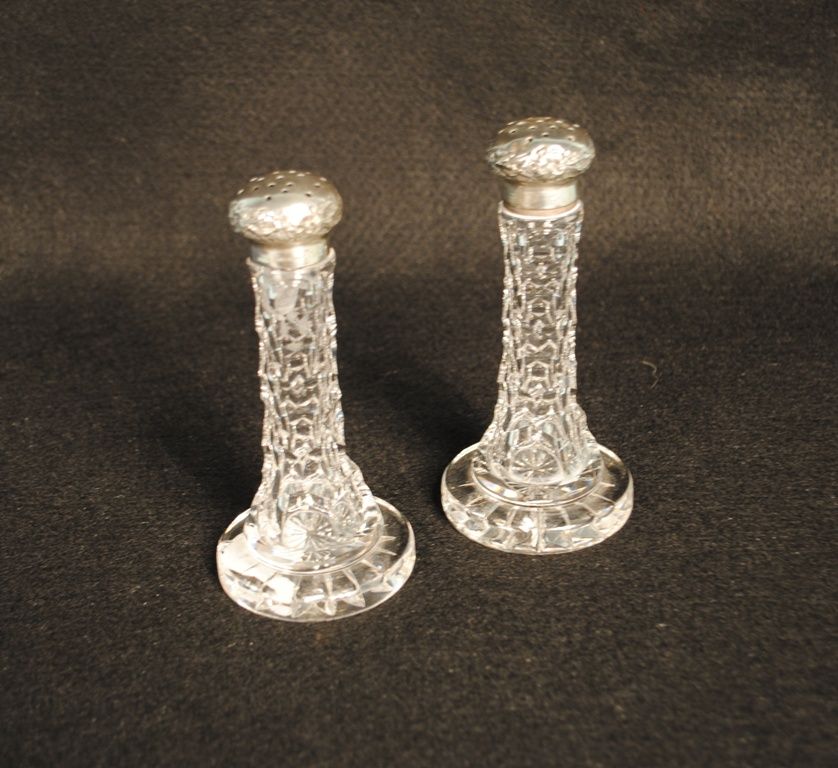 A matched pair of American Brilliant Cut Glass salt & pepper shakers with chased sterling silver lids and deeply faceted bodies, one signed " Clark" in etched script. Small chip to the base of one shaker. 5"h A matched pair of American Brilliant Cut Glass salt & pepper shakers with chased sterling silver lids and deeply faceted bodies, one signed " Clark" in etched script. Small chip to the base of one shaker. 5"h