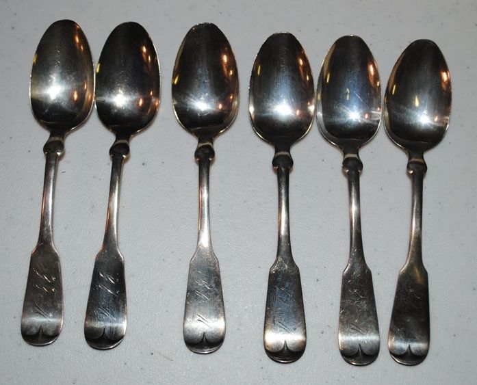 Set of six sterling teaspoons, monogram on handles. Set of six sterling teaspoons, monogram on handles.