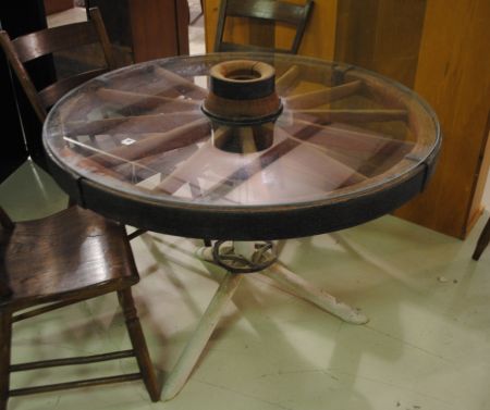 Antique wagon wheel ( from Brandon Hardware Store) made into glass top table 38" diameter, 29 1/2"h Antique wagon wheel ( from Brandon Hardware Store) made into glass top table 38" diameter, 29 1/2"h