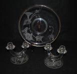416A Etched Glass Center Bowl, Pair of Etched Glass Candlesticks