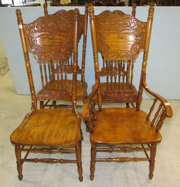 carved backs, spindles, 3 sides, one arm, 49"h. carved backs, spindles, 3 sides, one arm, 49"h.