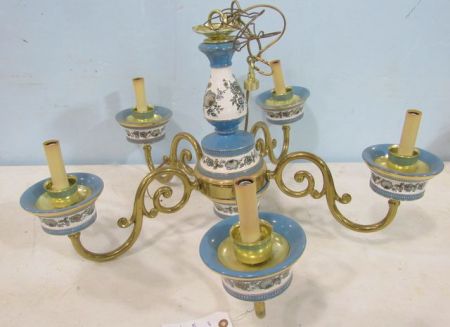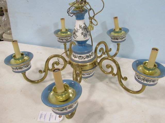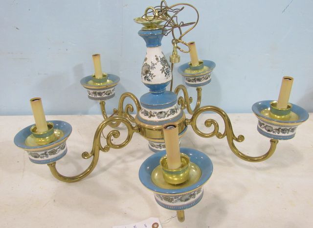 Teal and white porcelain with brass arms. Teal and white porcelain with brass arms.