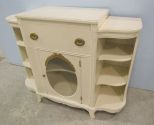 Gold painted trim, lifted top storage, oval glass door, Display shelves. Measures 37"h., 46"w. 16"d. Gold painted trim, lifted top storage, oval glass door, Display shelves. Measures 37"h., 46"w. 16"d.