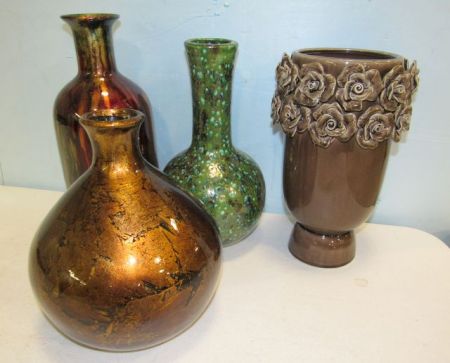 Glass Colored Vase 14"h., Glass Colored Vase, Glazed Ceramic Vase by Ham 13"h., Ceramic Flower Design Vase Glass Colored Vase 14"h., Glass Colored Vase, Glazed Ceramic Vase by Ham 13"h., Ceramic Flower Design Vase