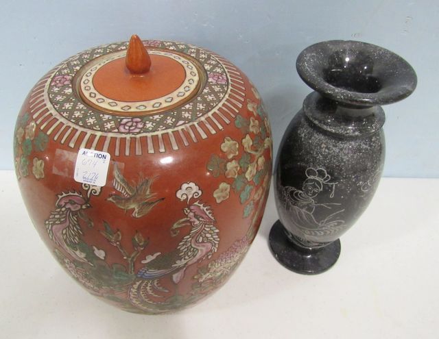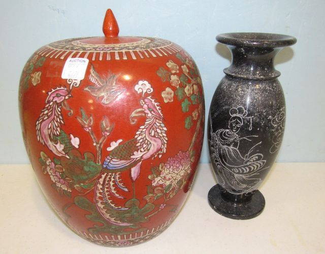 674 Large Chinese Ginger Jar and Marble Etched Asian Vase