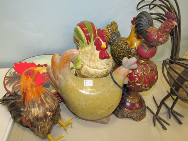 Four Roster Plates, Ceramic Candy Jar, Ceramic Crackled Rooster, Evergreen Pottery Rooster, Metal Decor Rooster, Resin Pedestal Rooster, Replica Feather Rooster. Four Roster Plates, Ceramic Candy Jar, Ceramic Crackled Rooster, Evergreen Pottery Rooster, Metal Decor Rooster, Resin Pedestal Rooster, Replica Feather Rooster.