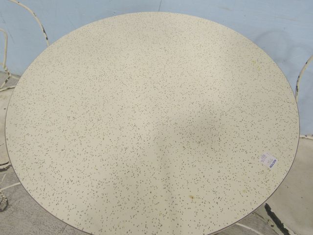 two metal chairs 24"h., Formica Top table Measures 20"h., 24"dia. two metal chairs 24"h., Formica Top table Measures 20"h., 24"dia.