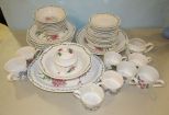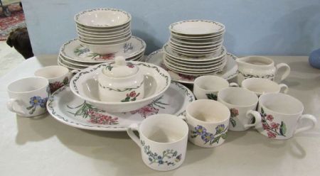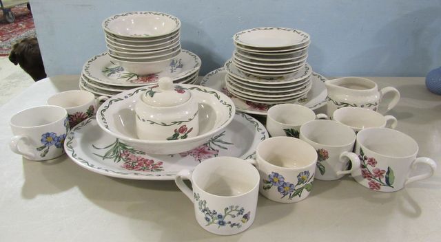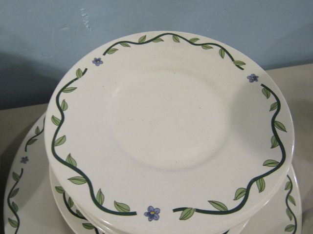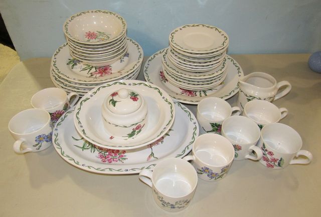 5 dinner plates, 8 saucers, 8 mugs, sugar, 7 bowls (one has chip), 6 salads, serving platter, large plate, creamer. 5 dinner plates, 8 saucers, 8 mugs, sugar, 7 bowls (one has chip), 6 salads, serving platter, large plate, creamer.